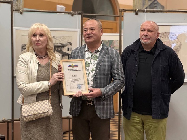На выставке присутствовала Елена Тихомира, заведующая мастерской художника Александра Тихомирова. Она вручила господину Лю Минсю грамоту с благодарностью от мэра города Благовещенска О. Г. Имамеева.