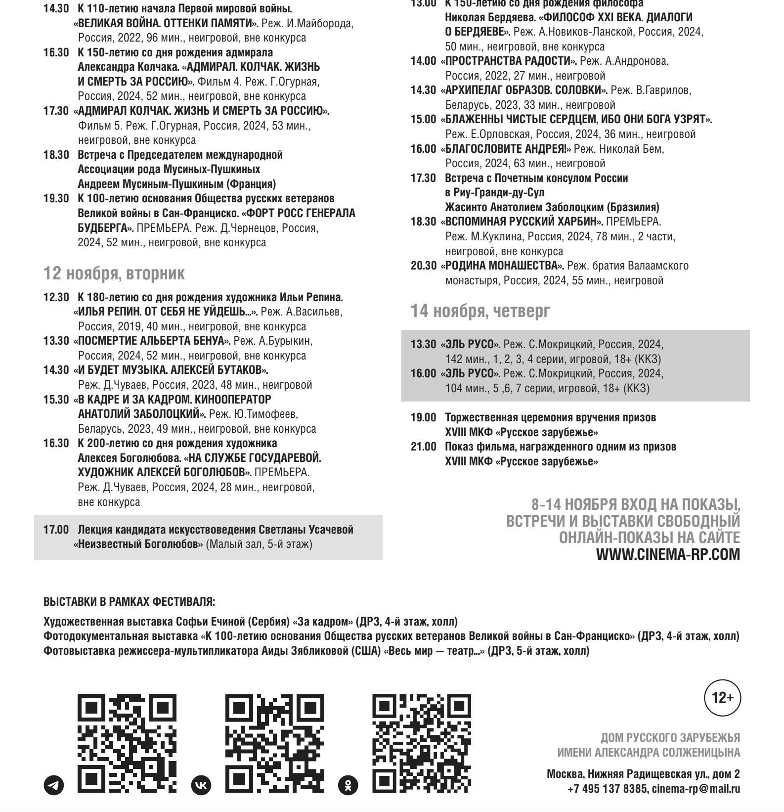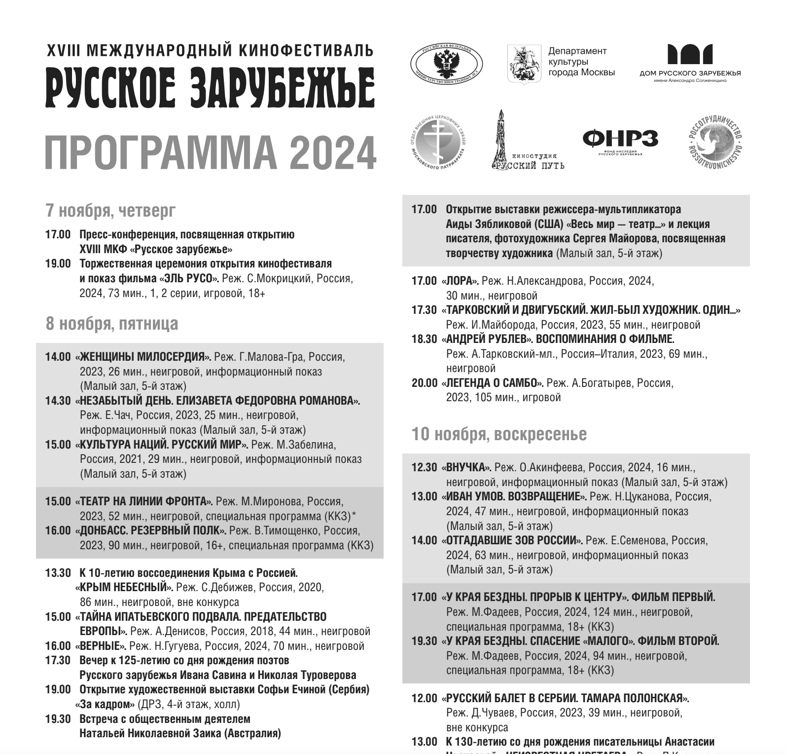 07 ноября в 17.00 пройдёт пресс-конференция, посвященная открытию XVIII МКФ «Русское зарубежье». В пресс-конференции примут участие организаторы, члены жюри, гости из России и из-за рубежа. На торжественную церемонию открытия фестиваля приглашены также попечители и почетные гости. Начало торжественной церемонии открытия фестиваля в 19.00 часов.