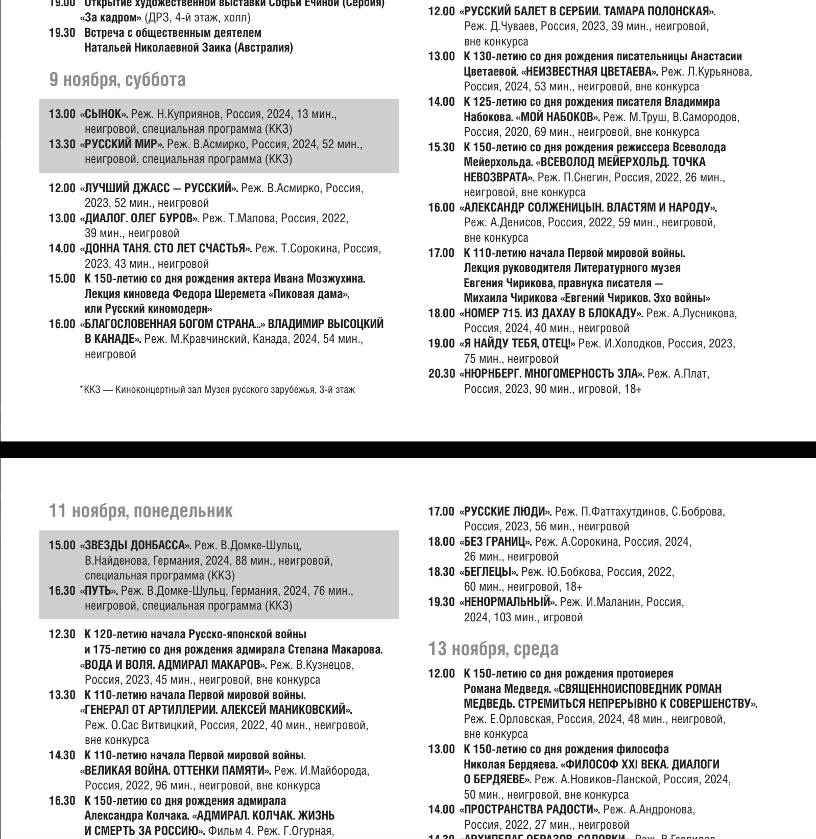Ряд картин, приурочены к памятным датам: 120-летию начала Русско-японской войны, 110-летию начала Первой мировой войны, 100-летию основания Общества русских ветеранов Великой войны в Сан-Франциско, юбилеям со дня рождения философа Николая Бердяева, художников Ильи Репина, Алексея Боголюбова, режиссёра Всеволода Мейерхольда, писателей Анастасии Цветаевой и Владимира Набокова. В рамках форума предусмотрена программа фильмов отечественных и зарубежных авторов, рассказывающих о Специальной военной операции, проводимой Россией на западных границах страны.