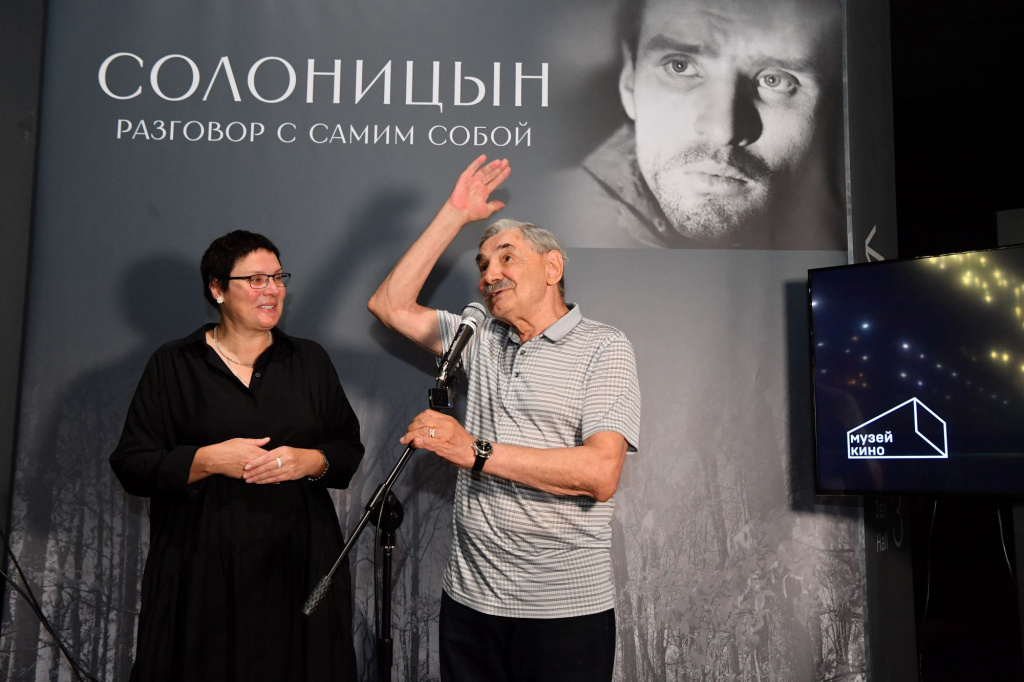 Масштабный выставочный проект Музея кино «Солоницын. Разговор с самим собой» рассказывает о жизни и творчестве выдающегося артиста: отдельные разделы выставки посвящены театральным работам, ролям в кино, отношениям с коллегами и родными. Среди материалов представлены личные фотографии, рабочие моменты со съемок, эскизы костюмов и декораций к фильмам «Андрей Рублев» (1966, реж. Андрей Тарковский), «В огне брода нет» (1967, реж. Глеб Панфилов), «Любить человека» (1971, реж. Сергей Герасимов), «Солярис» (1972, реж. Андрей Тарковский) и другим значимым картинам эпохи. Центральная зона выставки посвящена одной из последних ролей Солоницына в кино — в дипломном короткометражном фильме Александра Микулина «Разговор». Для воссоздания атмосферы фильма будет сформирована инсталляция с осенним лесом, на которую будет проецироваться отрывок из фильма.